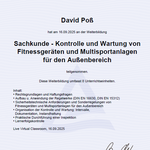 Skateanlagen, Multi-sportgeräte und standortgebundene Fitnessgeräte gehören zum Portfolio vieler Städte und Gemeinden. Auch für diese Prüfungen bilden wir uns weiter.