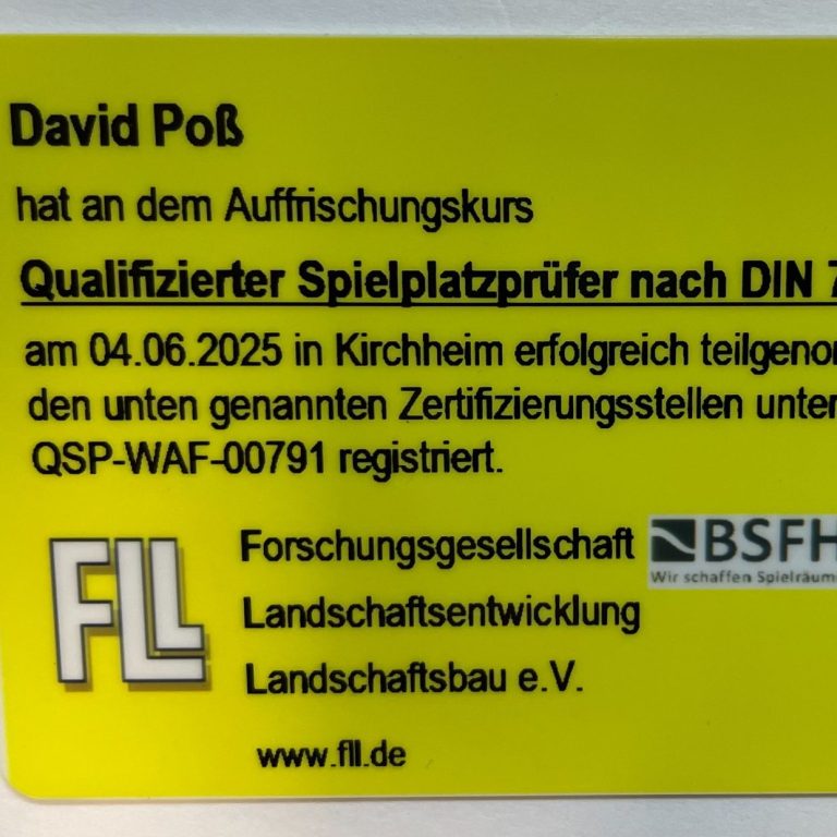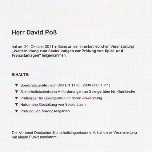 Wir verfügen seit 2008 über die Sachkunde zur Prüfung von Spiel- und Freizeitanlagen nach DIN EN 1176.